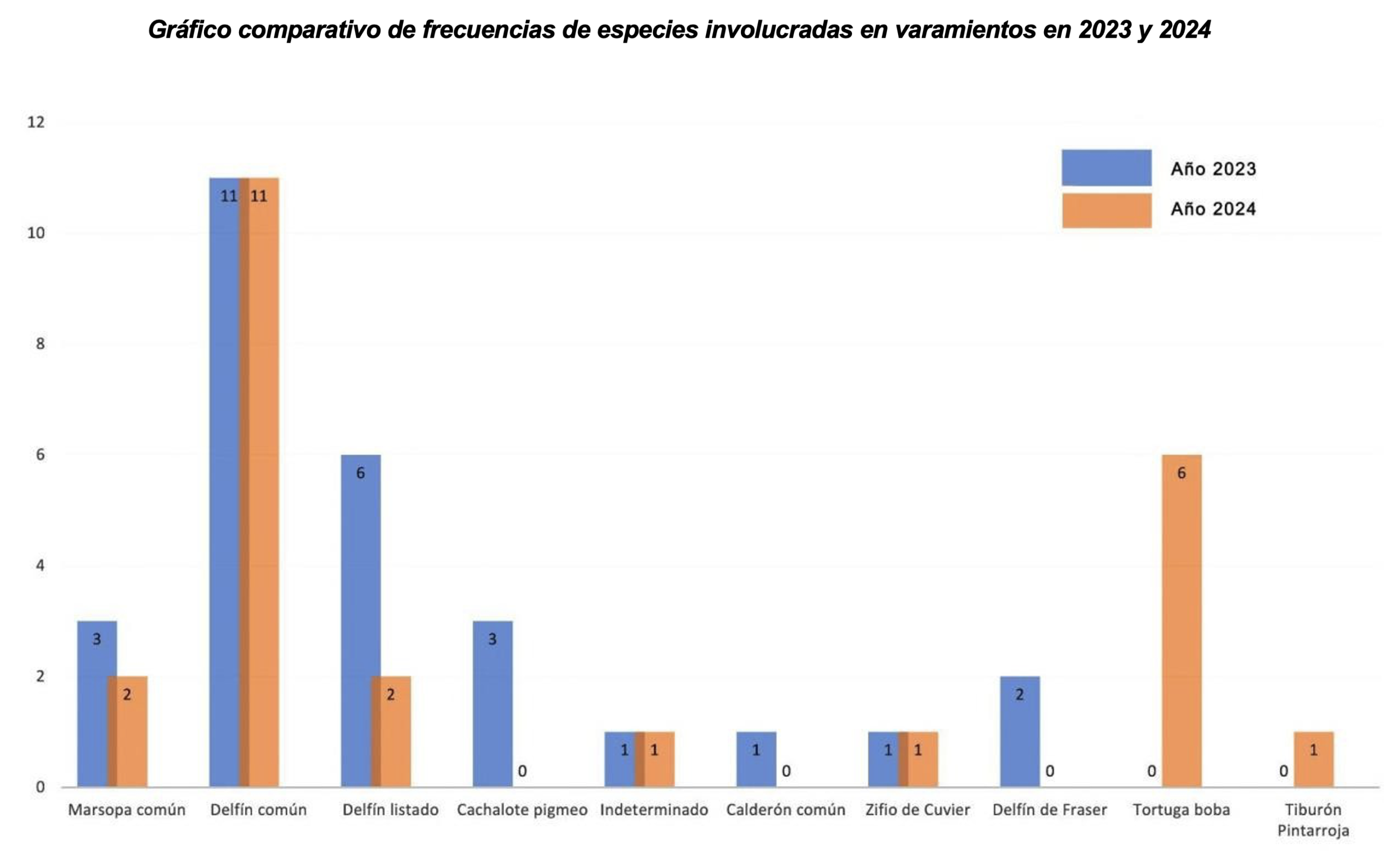 La siguiente comparativa entre los años 2023 y 2024, permite observar variaciones en la presencia y frecuencia de determinadas especies, lo que ayuda a identificar tendencias, posibles cambios ambientales o episodios excepcionales. Este análisis interanual aporta una visión dinámica del fenómeno de los varamientos y facilita la toma de decisiones basada en datos actualizados.
