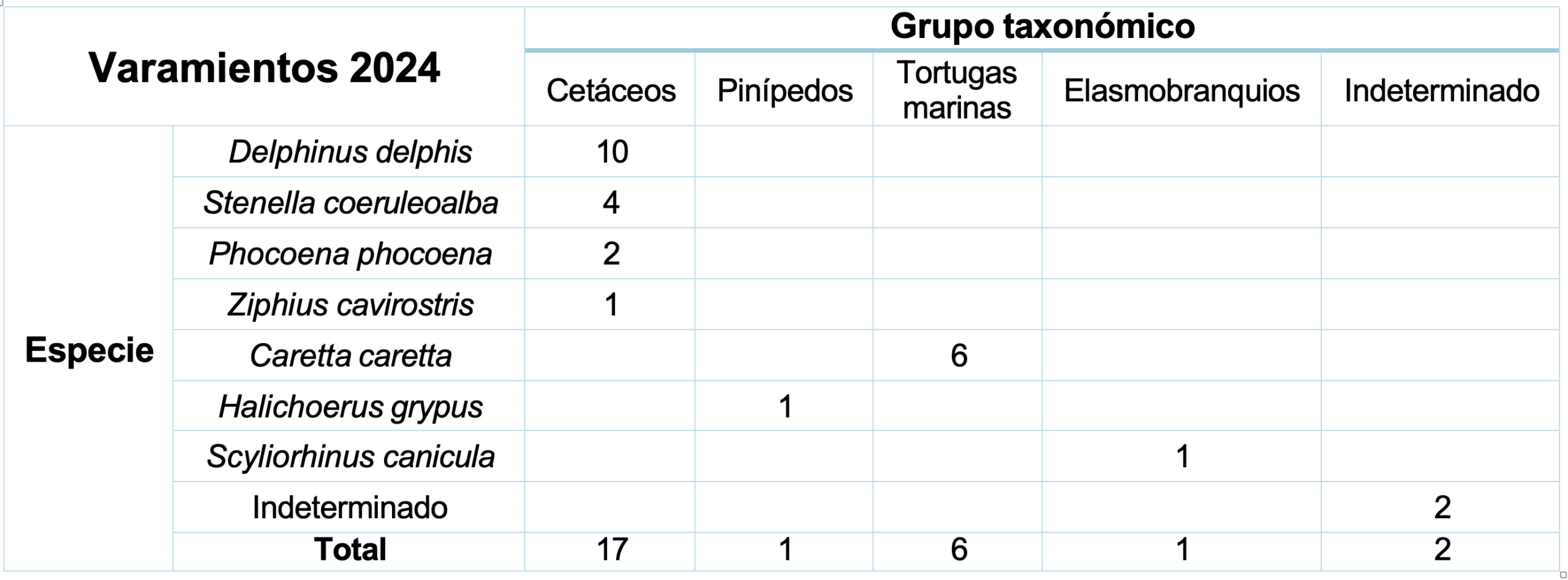 A través del registro sistemático de cada episodio ocurrido en 2024, se ha obtenido información valiosa sobre la presencia de especies, su distribución, los cambios en su comportamiento y los riesgos ambientales o sanitarios que pueden influir en estos eventos de varamiento. El análisis de estos datos, no solo permite mejorar la capacidad de respuesta ante los varamientos, sino también generar conocimiento científico que contribuya a la conservación de la biodiversidad marina. La recopilación ordenada de datos que se han recogido en el informe 2024, facilita la identificación de patrones espaciales y temporales, la comparación entre años y la evaluación del estado de los animales, proporcionando una base sólida para la gestión y planificación de medidas de protección.