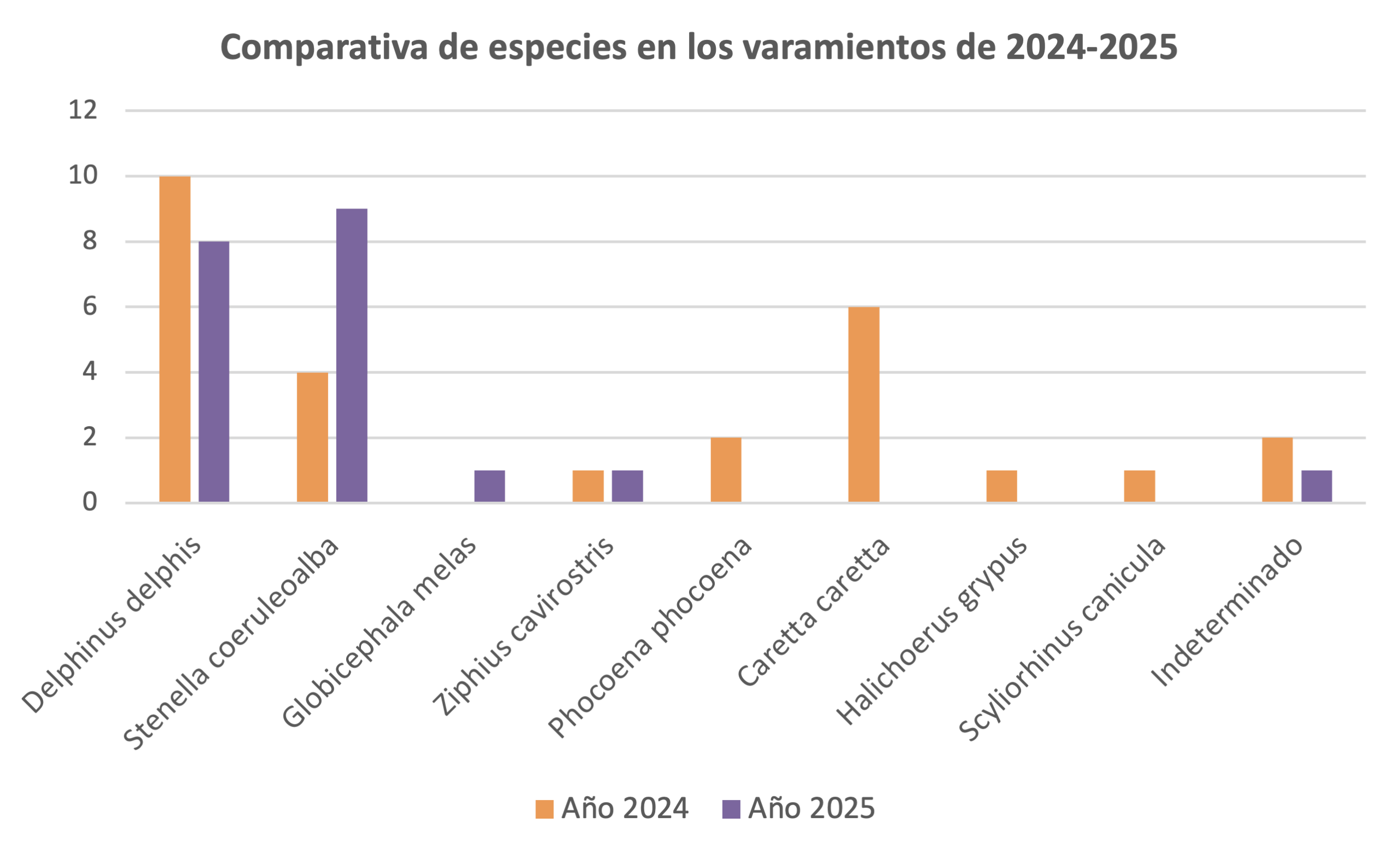 El análisis comparativo entre los años 2024 y 2025, permite observar variaciones en la frecuencia y diversidad de especies varadas, lo que ayuda a detectar tendencias, cambios ambientales o episodios excepcionales. Este enfoque interanual facilita una visión evolutiva del fenómeno y permite ajustar las estrategias de seguimiento y respuesta.